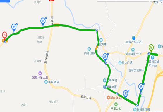 养正中学-城南派出所-罗家山小学-罗家山村-玉溪镇政府-大汉商业街-八中-尚书广场-国税局-湘一学校-电力公司-新妇幼保健院-保盛幸福城-泰山广场-法院-玫瑰园小区-百通汽车站