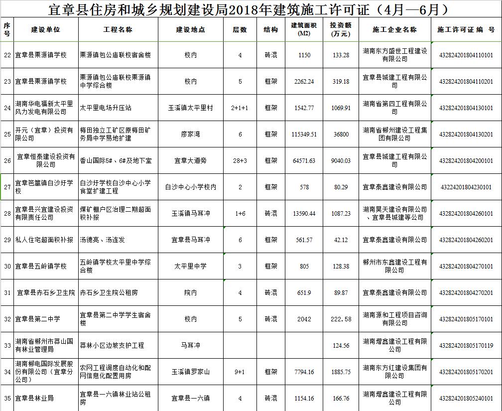 宜章县住房和城乡规划建设局2018年建筑施工许可证(4月—6月)的公示