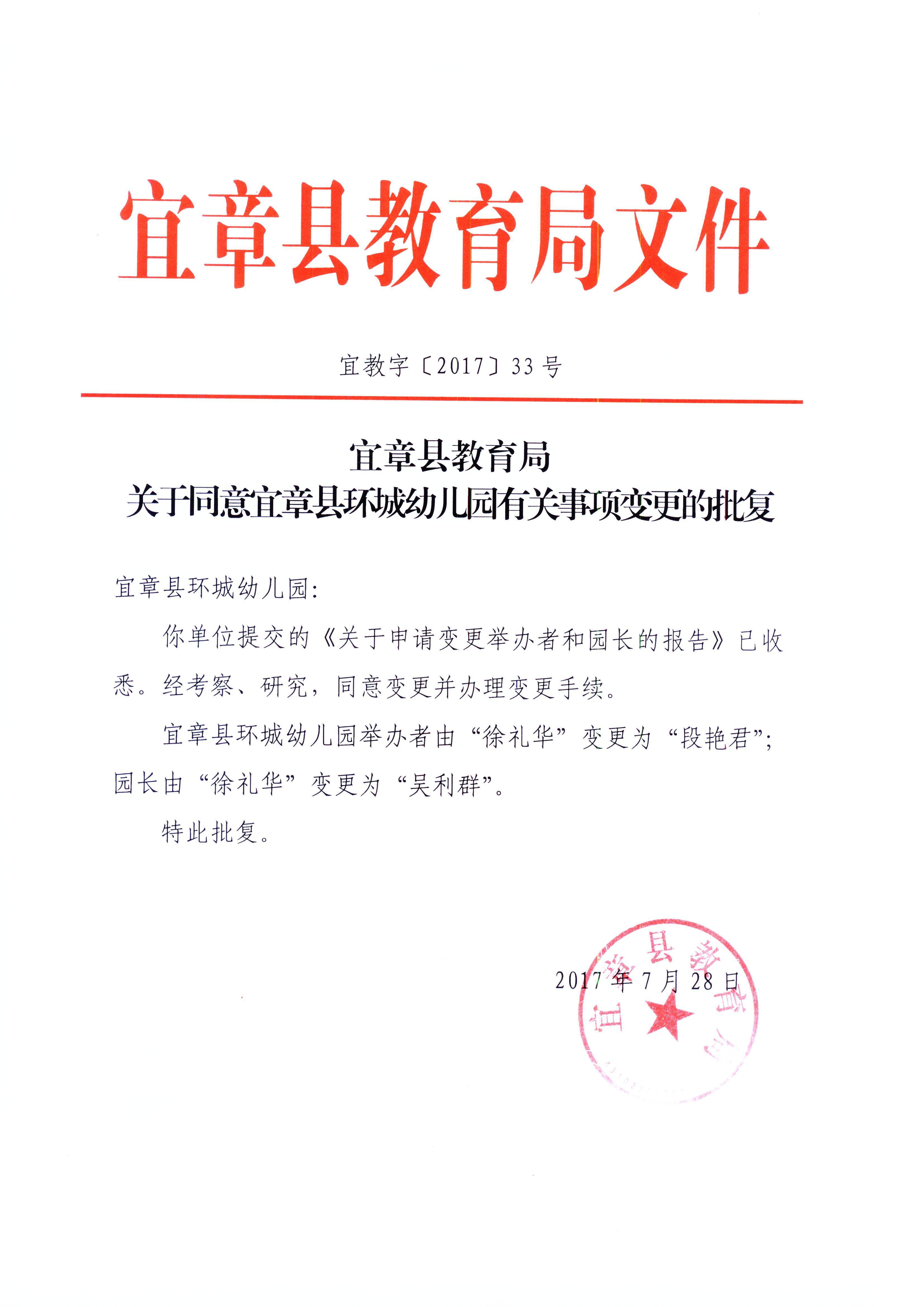 关于同意宜章县环城幼儿园有关事项变更的批复