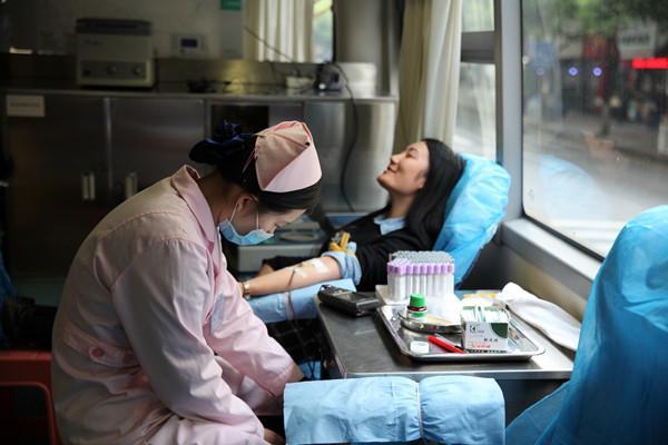 中国人寿保险公司郴州分公司综合部经理谭娜率先垂范,带头献血。