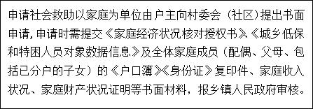 本人申请,提供所需申报材料→乡镇受理并组织入户调查→报县核对中心进行经济状况核对→乡镇组织村级召开民主评议会→一榜公示→乡镇审核→二榜公示→输入电脑,统一上报到县政务服务中心民政局窗口初审→县民政局组织入户抽查→县民政局审批→三榜公示→县民政局政务服务中心民政局窗口汇总发放。