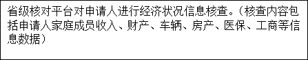 (三)经济状况信息核对。乡镇人民政府通过县级以上人民政府民政部门与公安、人力资源社会保障、住房城乡建设、税务、金融、工商等部门和机构,对申请家庭的户籍、车辆、住房、社会保险、养老金、存款、证券、个体经营、住房公积金等收入和财产信息进行核对