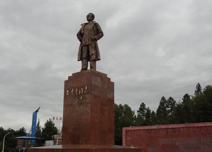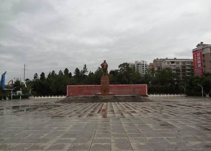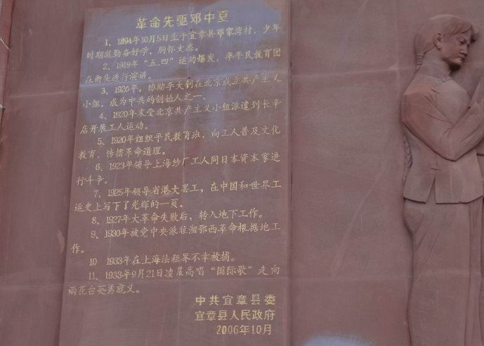 邓中夏铜像巍然屹立在纪念广场中央,底座至铜像高9.4米,铜像身高3.9米,国家主席江泽民亲自为“邓中夏同志”铜像题字。铜像后面的墙上雕刻着邓中夏烈士的生平事迹。
